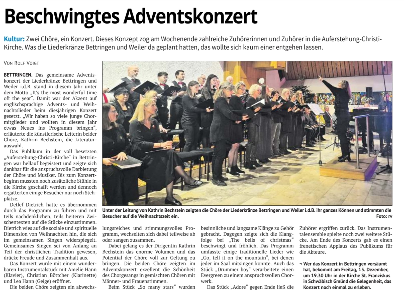 Vorweihnacht Die drei Chöre „Taktvoll“ Liederkranz Bettringen, Liederkranz Weiler und „Stimmkultur“ gestalten in der Auferstehung-Christi-Kirche in Bettringen ein stimmungsvolles Adventskonzert. Von Gise Kayser-Gantner, Gmünder Tagespost, 10.12.2024 |