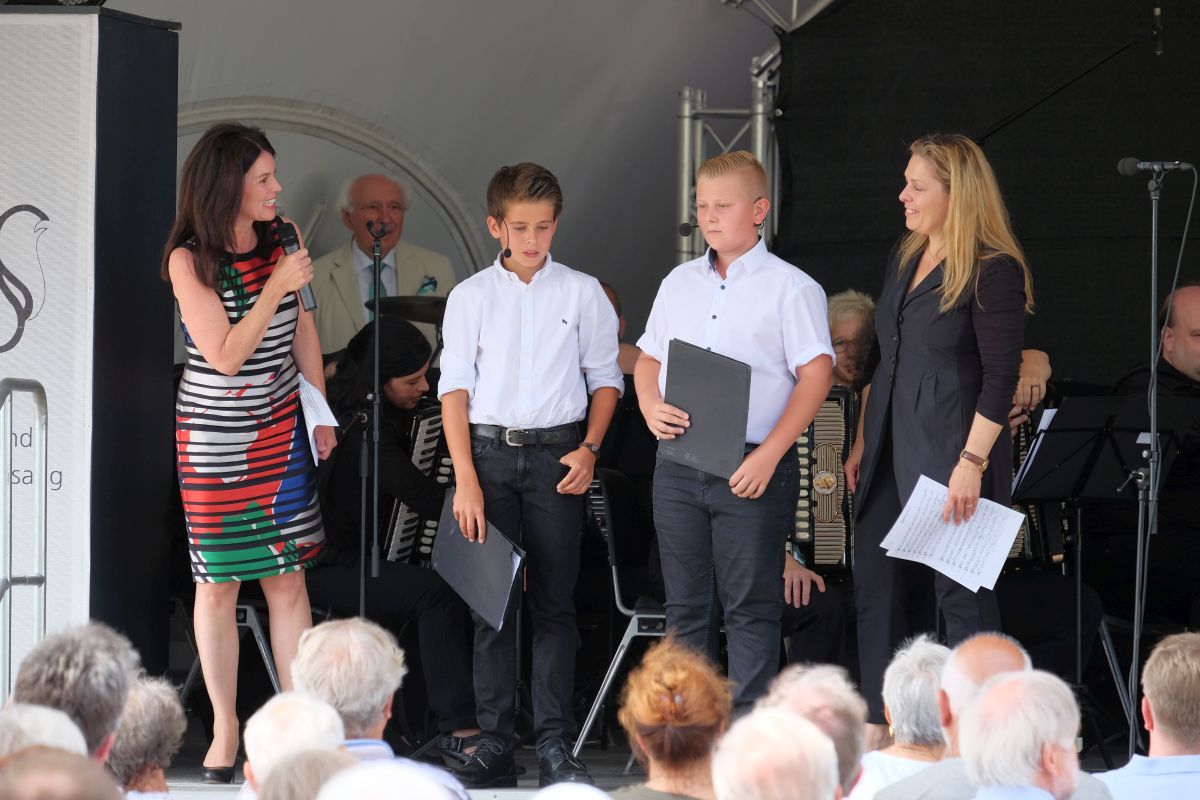 In seinen originalgetreuen Gewändern brachte der Chor Opera Gamundia des Liederkranzes Weiler in den Bergen Farbe auf die Bühne. Das war wörtlich zu nehmen, denn mit dem Lied aus „My Fair Lady“, „Es grünt so grün“ und „Schenkt man sich Rosen in Tirol“ kamen auch neue Töne ins Programm, begleitet von Michael Holder am Klavier. Sehr innig und anrührend die beiden Solisten der St. Michael Chorknaben Moritz Graeve und Lukas Ewald mit dem „Abendsegen“ aus Engelbert Humperdincks „Hänsel und Gretel“. |