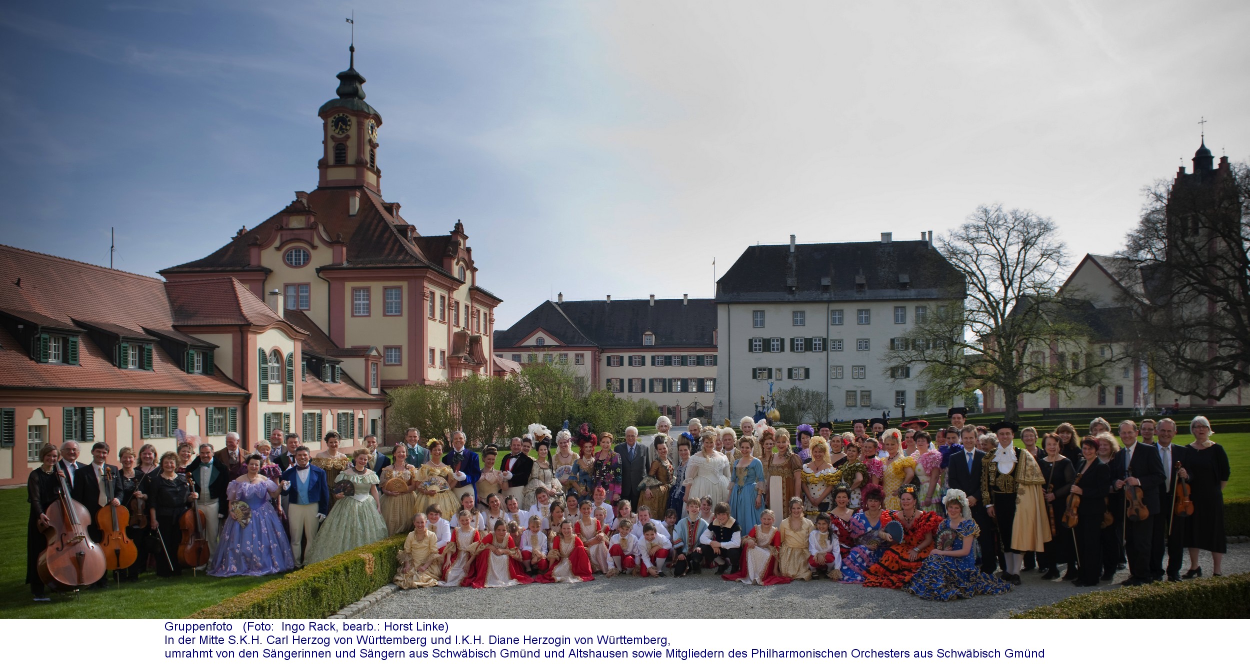 Der Liederkranz Weiler in den Bergen ist bekannt für seine szenischen Auftritte in farbenprächtigen und außergewöhnlichen Kostümen. Vor kurzem hatte der Chor einen Auftritt, der wohl einmalig in der Vereinsgeschichte sein dürfte. Zusammen mit Sängerinnen und Sänger aus Altshausen unter der Leitung von Werner Schnierer war der Liederkranz, verstärkt durch Facciomi Cosi aus Urbach und den Solostimmen von D’Ann Ricciolini, Kathrin Bechstein, Brigitta Wanner, Richard Arnold und Johannes Grimm, Mittelpunkt des Festabends anlässlich der Geburtstagsfeierlichkeiten I.K.H. Diane Herzogin von Württemberg. Der Projektchor „Herzogin-Diane-Chor“ stand unter der Gesamtleitung von Werner Schnierer.