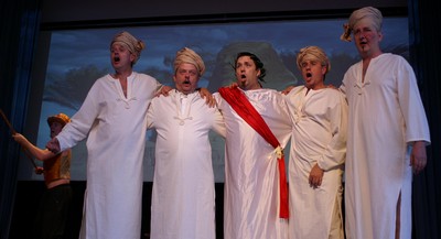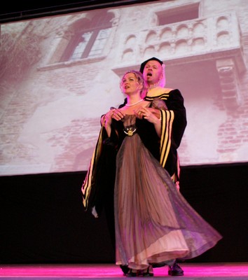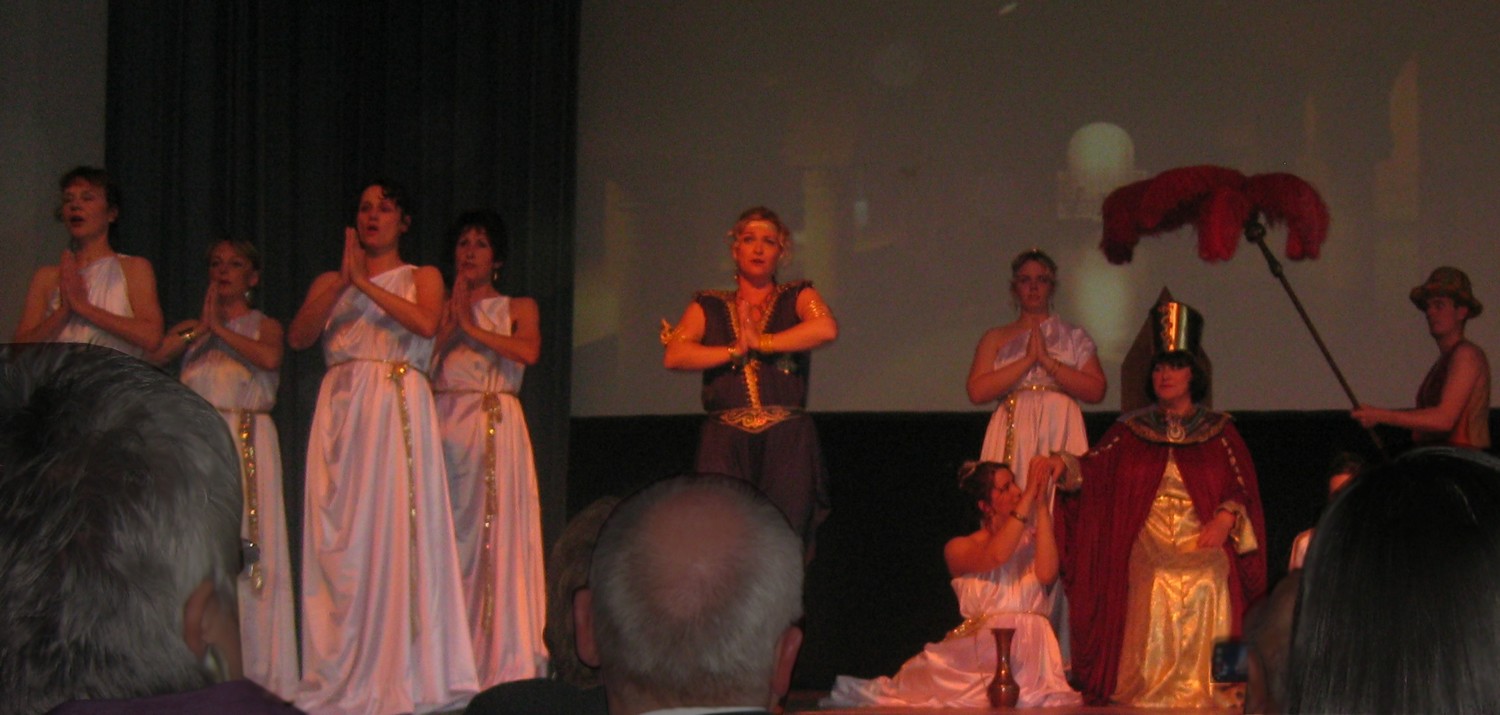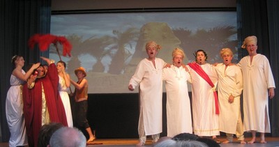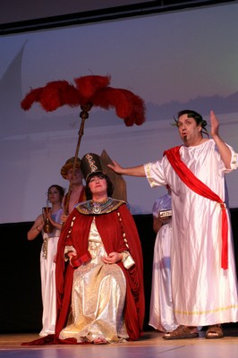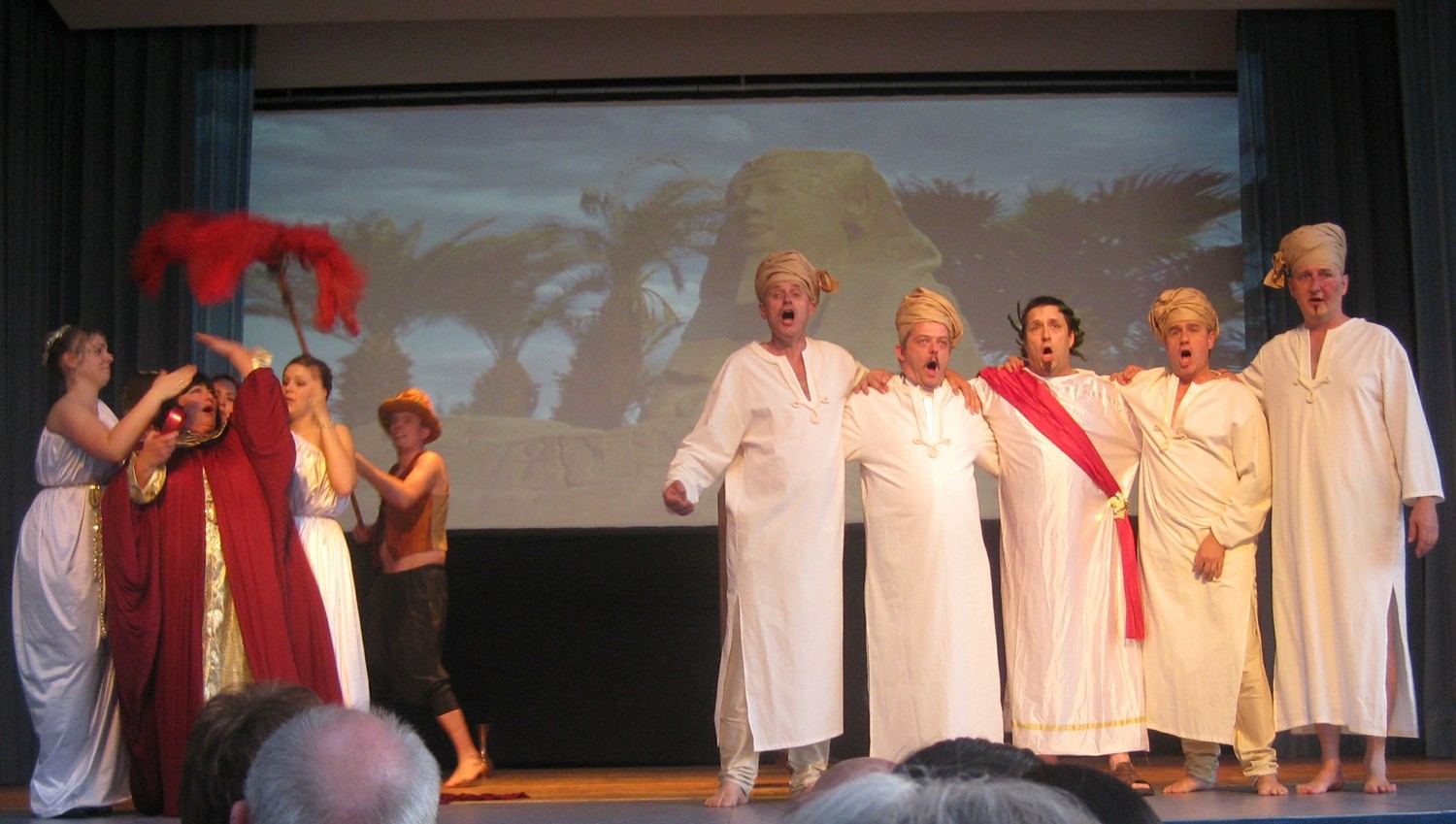 Der gesamte Part um Cäsar und Cleopatra wurde von Andrea Cox, Toni Schleicher und Michael Baumann gesungen. Hätte es damals schon Tankstellen gegeben und ein paar Kumpels, die Cäsar zugeredet hätten, wie’s „ein Freund, ein guter Freund“ gemeinhin tut, die Geschichte würde sich heute anders lesen. Richtig Freude machte an diesen beiden Abenden Andrea Cox. Als Ägyptische Schönheit („liebes kleines Fräulein“?) ist sie so präsent auf der Bühne wie die Julia. |
