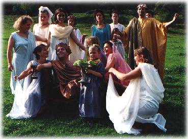 Tolle Bilder werden auf die von Herbert Baur und Berthold Feifel mit großem Aufwand gestaltete Bühne gezaubert. Der Liederkranz hat keine Mühe gescheut und beim Nationaltheater Mannheim eine Fülle passender Kostüme ausgeliehen. Treffend gestaltet Elser ihre Charaktere: Dionysos (Michael Kietzmann mit tollem Bass-Solo) wird auf dem Diwan liegend in den Saal getragen; der im Götterstreit als Schiedsrichter beigezogene Philosoph Diogenes (wer könnte ihn besser spielen als Hannes Dunkl) sitzt hintergründig lächelnd auf seiner Tonne. |